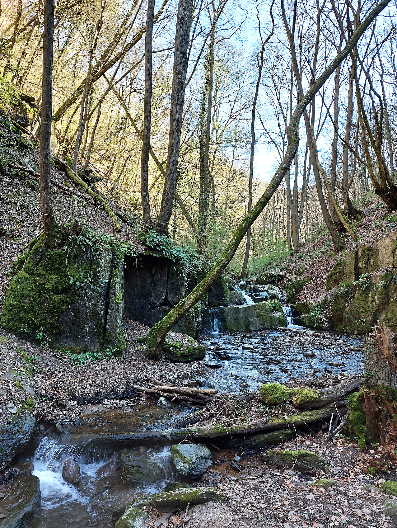 Die Landschaft ändert sich natürlich entsprechend: Statt niedrig gewachsener Krüppeleichen und Buchen nun weite Felder, Gebüschzeilen säumen den Hangübergang. Auf weichen Wiesenwegen geht es auch mal Feldgemarkungen entlang, schließlich, nach Überqueren einer Kreisstraße, wieder in den Wald und hinab in Richtung Schrumpfbachtal. Das Waldtal macht einen verwunschenen Eindruck, nahe des Pfades äugt vorsichtig hinter einem Baum halb versteckt ein Reh hinüber, die Waldvögel singen – eine Idylle.