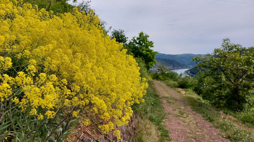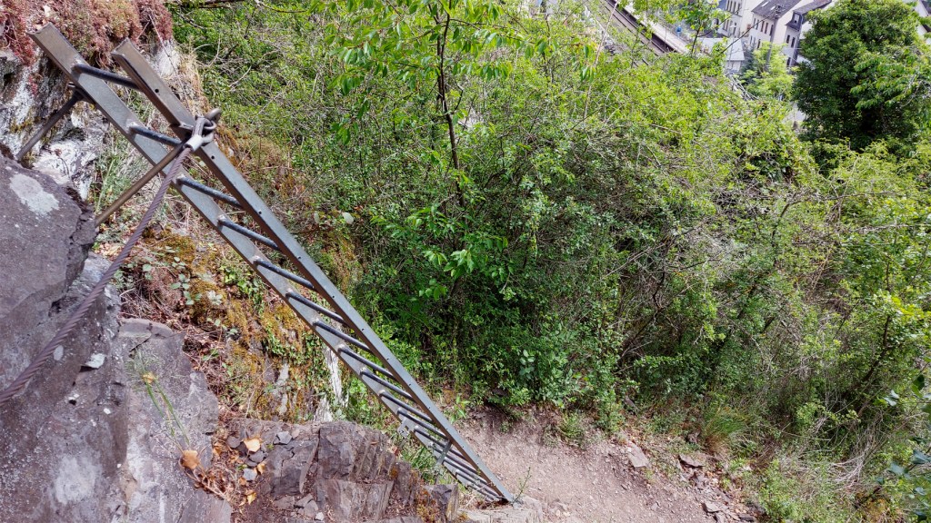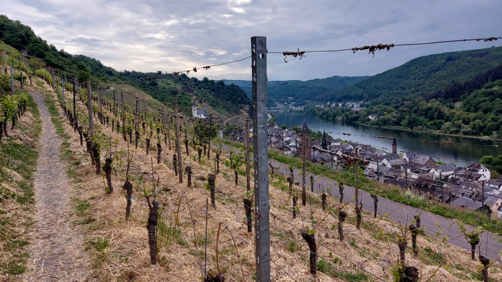 Jäh geht es von der Straße hinauf über Schiefer und Fels, der Pfad macht schon hier seinem Namen alle Ehre. Eine Seilsicherung ist an besonders steiler Stelle des Aufstiegs gespannt – und dann ist das Spektakel auch schon wieder vorbei. Entspannt schlendert man durch einen aufgelassenen Weinberg und dann oberhalb der Wingerte weiter. Der Pfad belohnt mit Blicken auf das schon erstaunlich tief unten im Moseltal liegende Städtchen mit seinen beiden Kirchen.
