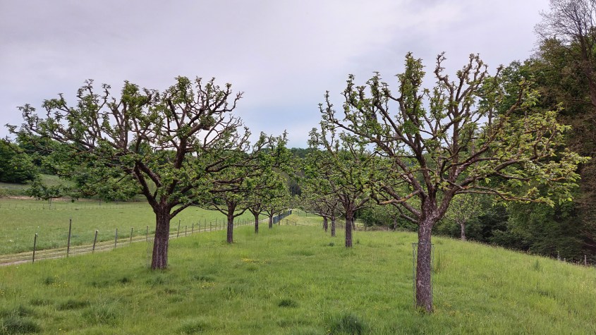 Was man so zügig an Höhenmetern verloren hat, muss im Tal angekommen nach erneuter Überquerung einer Kreisstraße natürlich wiedergewonnen werden. Es beginnt ein knackiger längerer Anstieg durch den Hochwald. Oben auf der Höhe angekommen führt der Weg an Schafweiden, Streuobstwiesen und einer große „Bienenweide“ vorbei zum westlichen Wendepunkt des Weges. Ab hier geht es wieder hinab in den Wald, in Richtung der steilen Weinberge und des „Moselpanoramawegs“.