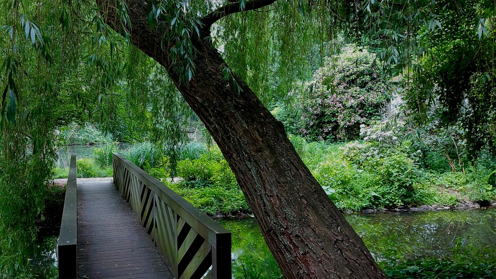 So wirkt eine Galerie großer Kopfskulpturen der Khmer aus dem 12./13. Jahrhundert in der „Orangerie“ besonders exotisch vor einem trüben Flussarm der Erft, bestanden mit großblättrigen tropischen Pflanzen und Bäumen. Hier wachsen mehrere Meter hohe Rhododendren, Brücken und Stege führen zu versteckten kleinen Pavillons, oder oberhalb eines weiteren Zulaufs zur Erft zu einem abgeschiedenen kreisrunden Kultplatz mit einem voluminösen Ritualstößel neben einem sitzenden Ganesha.