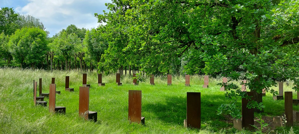 Eine Gruppe von ebenfalls übermannsgroßen gleich hohen „Wächtern“ Anataols steht etwas entfernt auf der Terrassenstufe der Erft-Senke, bedrohlich in Reih und Glied. Platziert sind sie in einer Baumgruppe, die ebenfalls exakt auf Abstand gepflanzt und in der Höhe beschnitten ist. Solche gezielt gesetzte Kunst-Natur-Spannungen gibt es im Außengelände der „Insel“ immer wieder.