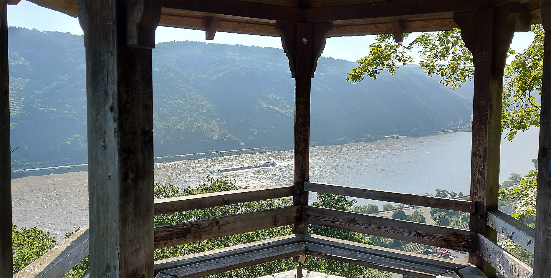 Als Rheinsteigwanderer hat man den harten Aufstieg den Rossstein hinauf bis aufs Plateau, wo eine Wanderhütte wartet, in bester Erinnerung. Der Pavillon ist von Oberwesel aus noch gerade zu erkennen.