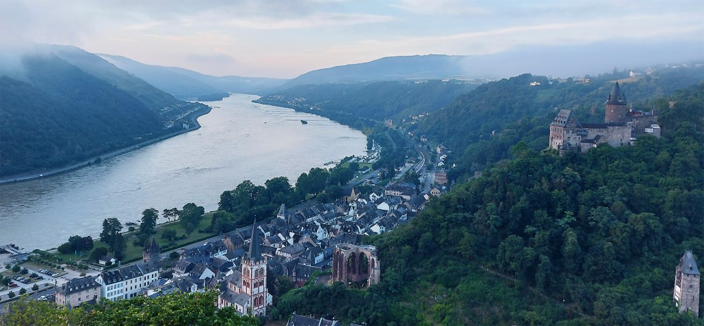 Bei der frühmorgendlichen Anfahrt zum Startpunkt der Doppeletappe des RheinBurgenWeges flussaufwärts in Bacharach liegt das UNESCO-Welterbe „Oberes Mittelrheintal“ noch unter einem dicken Nebelwulst begraben. Das wird sich ändern, nach und nach werden zuerst die oberen Ecken des alten Winzerstädtchens ins Sonnenlicht getaucht: Die Burg Stahleck, die Ruine der gotischen „Werner Kapelle“, die Pfarrkirche St. Peter, der Postenturm im Weinberg.