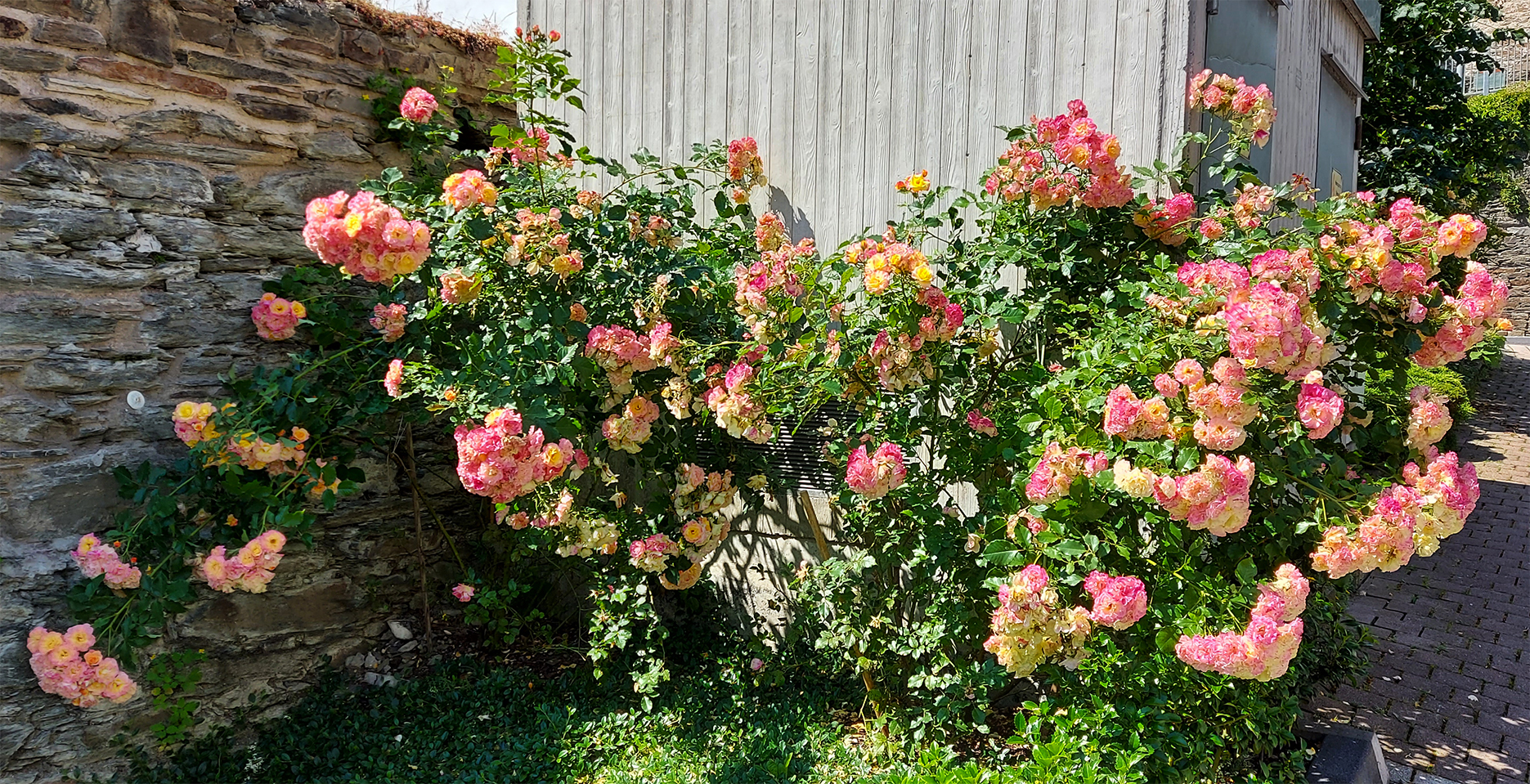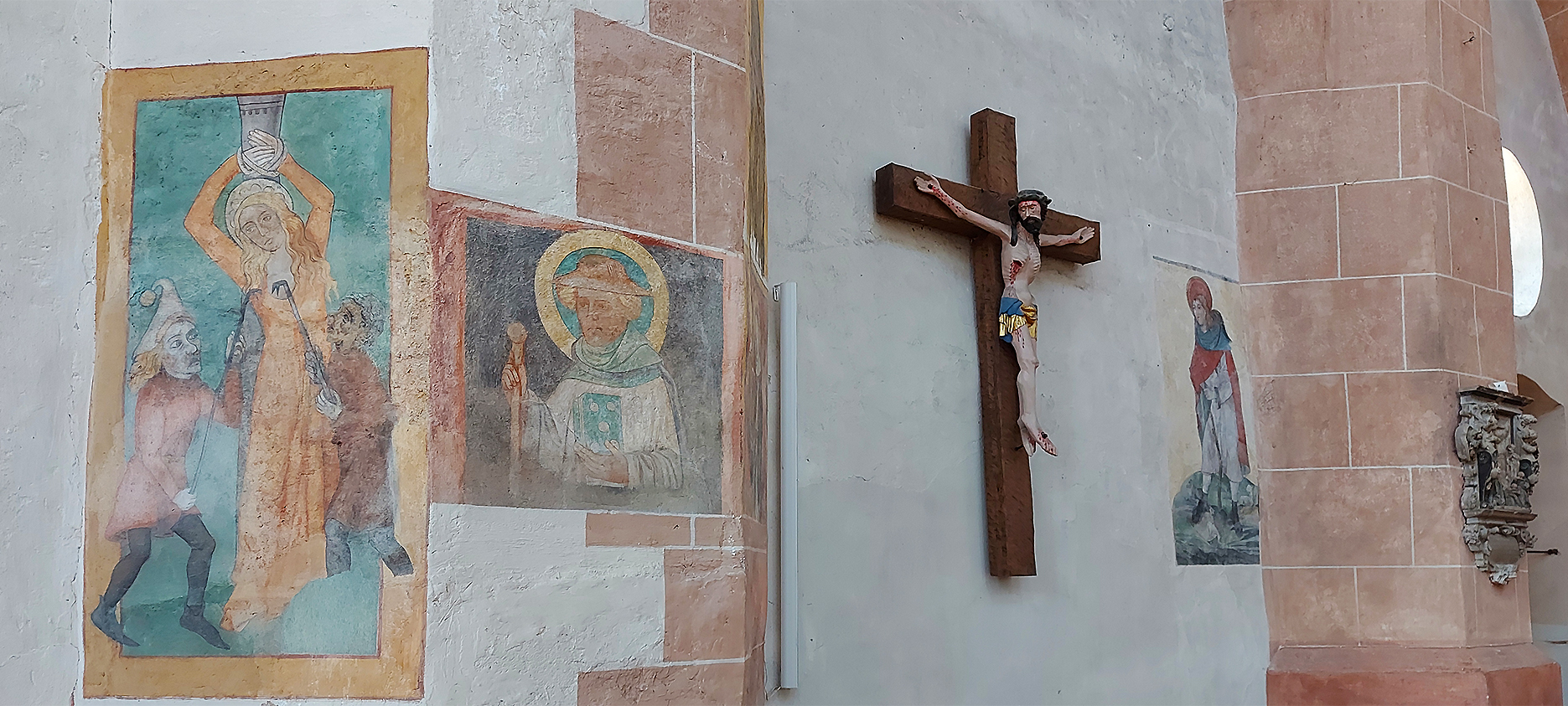 Oberwesel: Das alte Küsterhäuschen an St. Martin, mittelalterliche Ausmalungen in St. Martin, Rosen am „Ochsenturm“.