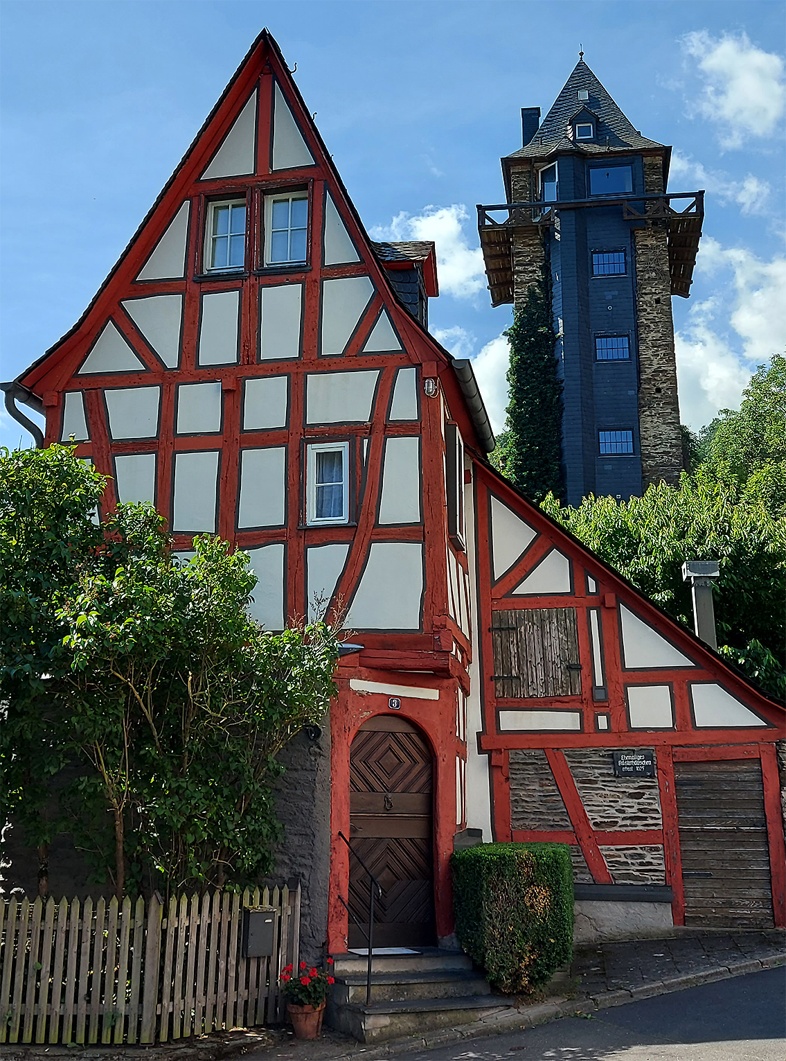 Durch den „Malerwinkel“, ein besonders idyllisches Fachwerkquartier, geht es durch das Steeger Tor jetzt schnell steil über Stufen und Pfade im Weinberg hinauf bis zum „Heinrich-Heine-Blick“ auf Bacharach und das Rheintal flussaufwärts Richtung Lorch und die nördlichsten Ausläufer des Weinanbaugebietes Rheingau.