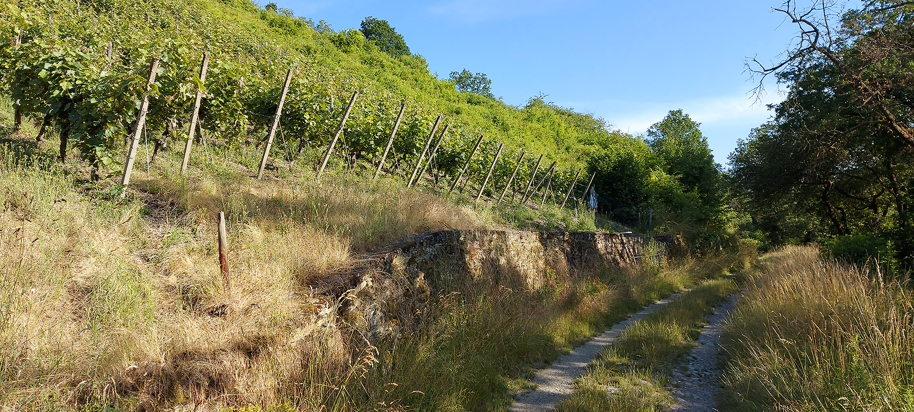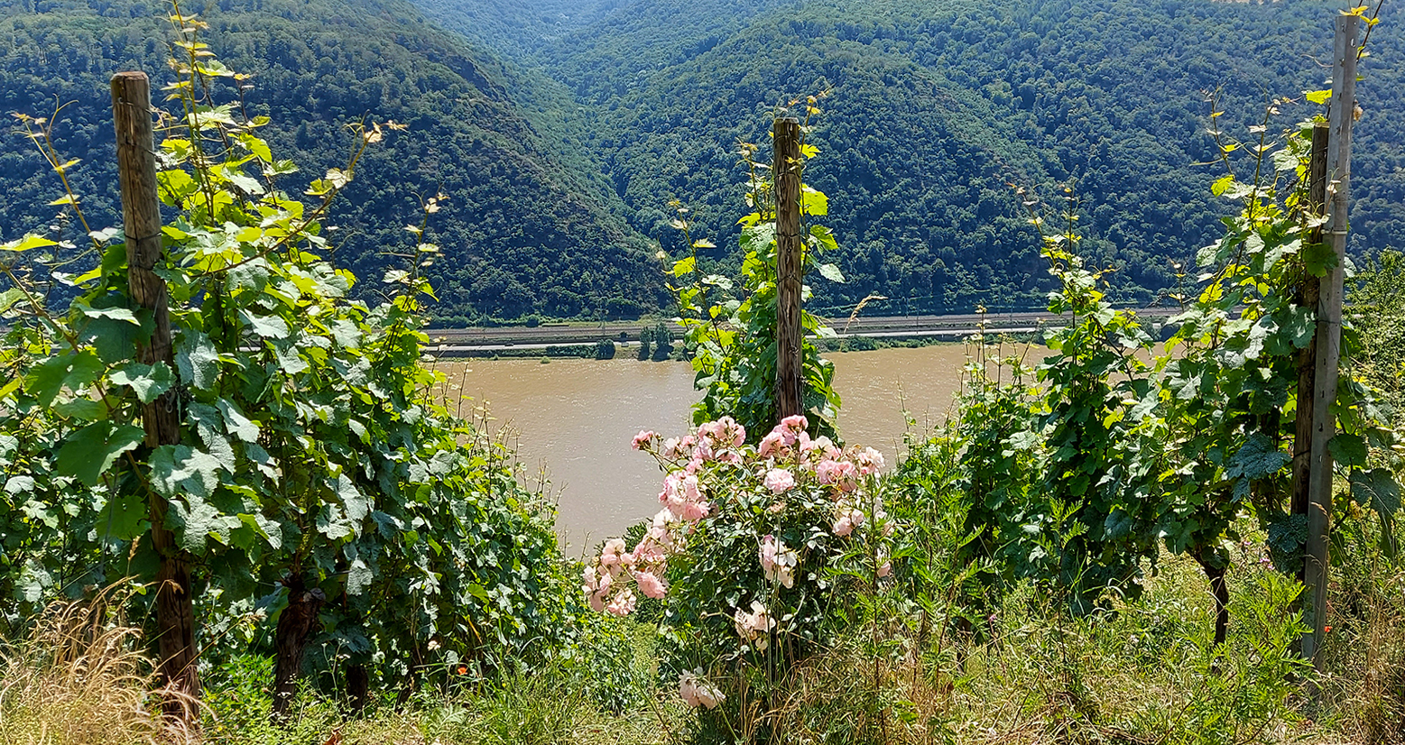 Am Rand erster Rebenzeilen kurz ein Blick auf den Bacharacher Werth, die Insel ist Monopollage des örtlichen Vorzeigeweinguts Hahnenhof von Toni Jost, geht es nun immer an der Hangkante entlang.