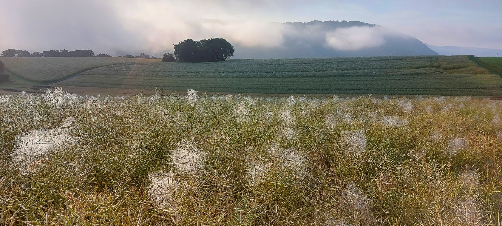 Hier auf dem Rheinplateau sind die Wiesen am frühen Morgen noch taunass, unzählige Spinnennetze in feinen Astgespinsten verblühten Rapses glitzern im Sonnenlicht. Nebelfetzen wabern, reißen auf, blau leuchtet der Sommerhimmel hindurch. Am Waldrand äsen Rehe, Wildgänse haben sich zu Gruppen in den ersten Sonnenflecken auf den Wiesen versammelt und steigen unter Protestgeschrei auf, als sich der Wanderer nähert.