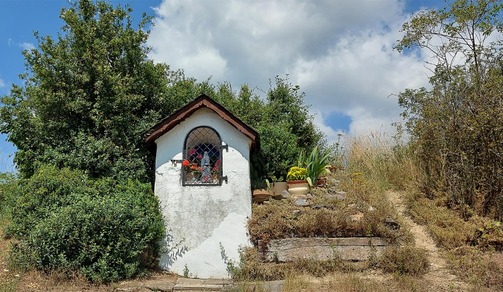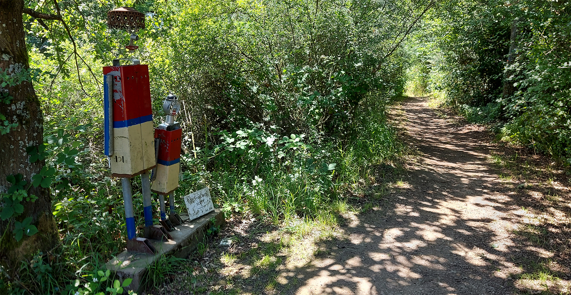 Weiter geht es den Berg hinauf und über den einen Kilometer langen „Trollpfad“, ein Skulpturenweg mit einer Reihe munterer Stahlrohr-Blech-Gesellen am Wegesrand. Danach ist der Anstieg beendet. Am „Büttenplatz“ lohnt sich eine Verschnaufpause unter dem Schatten spendenden Dach des Wanderpavillons. Der lange Weg hinauf auf 257 Meter wurde nötig, weil der „Ölbergsteig“, einer von zwei Klettersteigen im Oberen Mittelrheintal, nach wie vor wegen Felsbruchgefahr gesperrt ist.