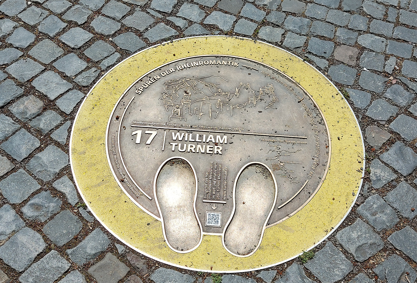 Ein anderer berühmter Zeitgenosse der Günderode soll aber tatsächlich hier gewesen sein: J.M.W. Turner (1776-1851), malte während seiner Rheinreise 1817 den Blick auf Oberwesel und den Rhein. Eine im Boden eingelassene Bronzetafel, Station der „Turner-Route“, enthält zum Thema auch einen QR-Code fürs Smartphone.