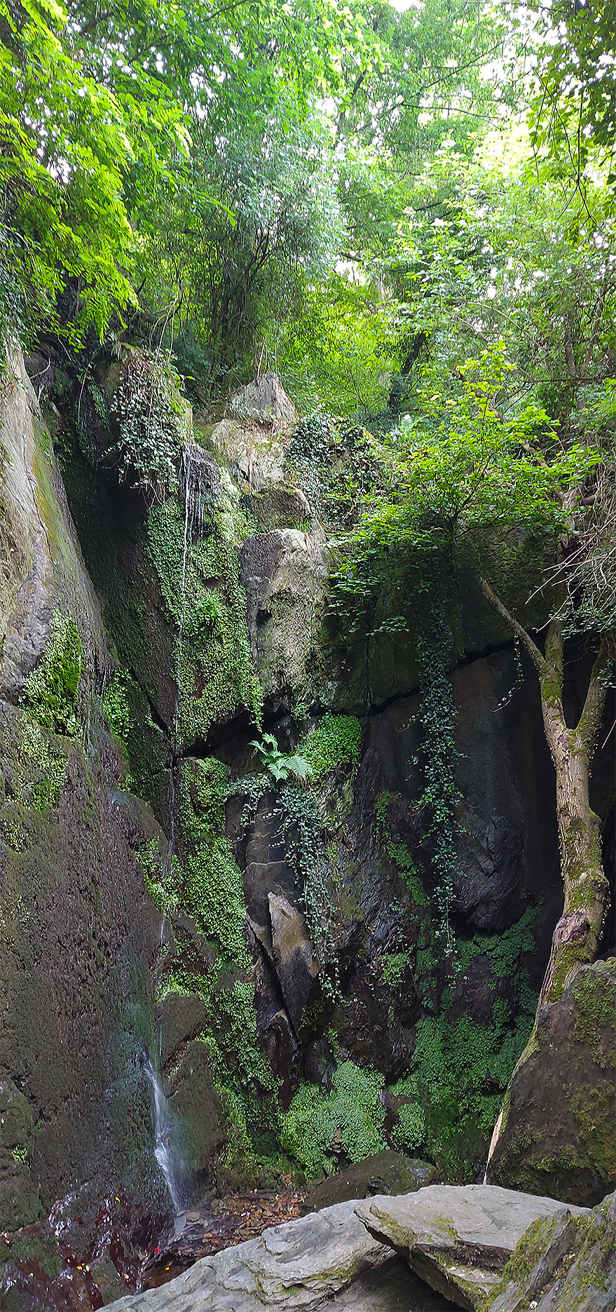 Es folgt am Ende dieser Doppeletappe des RheinBurgenWeges der Abstieg nach St. Goar über hunderte von Stufen und vorbei am „Wunschwasser“. So hat man den gerade sehr dünnen Wasserfall genannt, der oberhalb eines scharfen Einschnittes im Schiefergestein in Kaskaden herabstürzt und sich dann als Bächlein den Weg durch St. Goar zum Rhein sucht. Man solle einen Wunsch auf einen der umherliegenden Schiefersplitter schreiben, heißt es, und die Schrift, abgewaschen vom Wasser, so in die Welt tragen lassen.