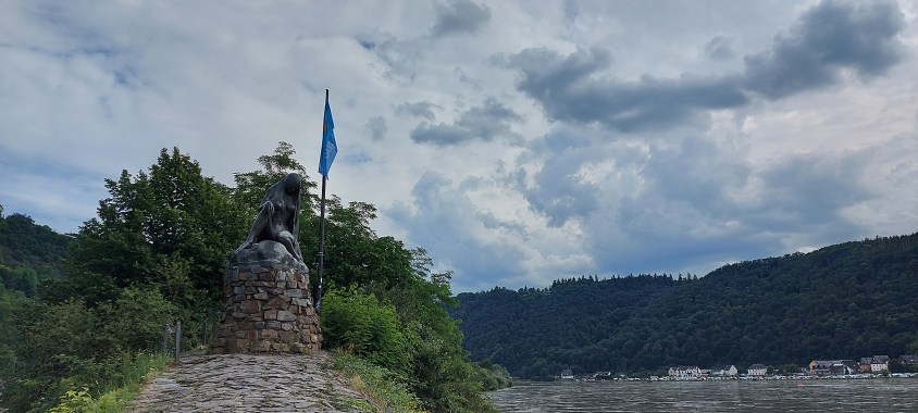 Jetzt, zum krönenden Abschluss, die Autofähre hinüber nach Goarshausen genommen. Wenige Kilometer flussaufwärts, schon unmittelbar vor dem Loreleyfelsen, ist die Zufahrt zur Hafenmole. Ein 15-minütiger Fußweg führt zu deren Spitze und zur „Loreley-Statue“. Die1983 hier aufgestellte 3,30 Meter hohe Bronzeskulptur stammt von der Bildhauerin Natascha Alexandrova Prinzessin Jusopov. Das ist vermutlich eine weitere rheinromantische Geschichte…