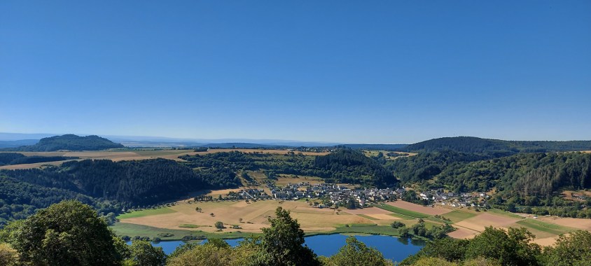 Oben angekommen reicht der Blick bei klarer Sicht bis zu Windkraftanlagen bei Morbach im Hunsrück, das ist immerhin rund 60 Kilometer entfernt. Näher sind von hier oben die erheblichen Trockenschäden nach drei zu trockenen Sommern in den Mischwaldhängen rund um das Meerfelder Maar.