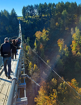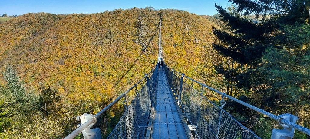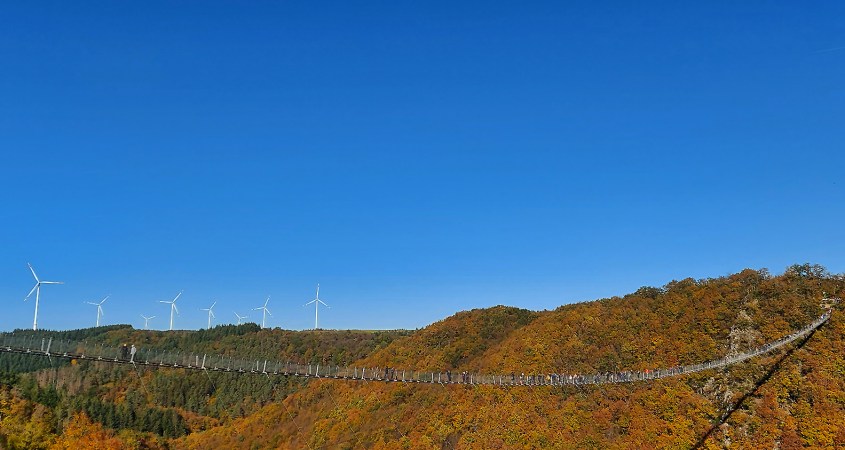Denn mit 360 Metern Länge ist die Brücke im Vorderhunsrück um 98 Meter kürzer als die 458 Meter lange Hängeseilbrücke über den kleinen Fluss Rappbode im Harz.