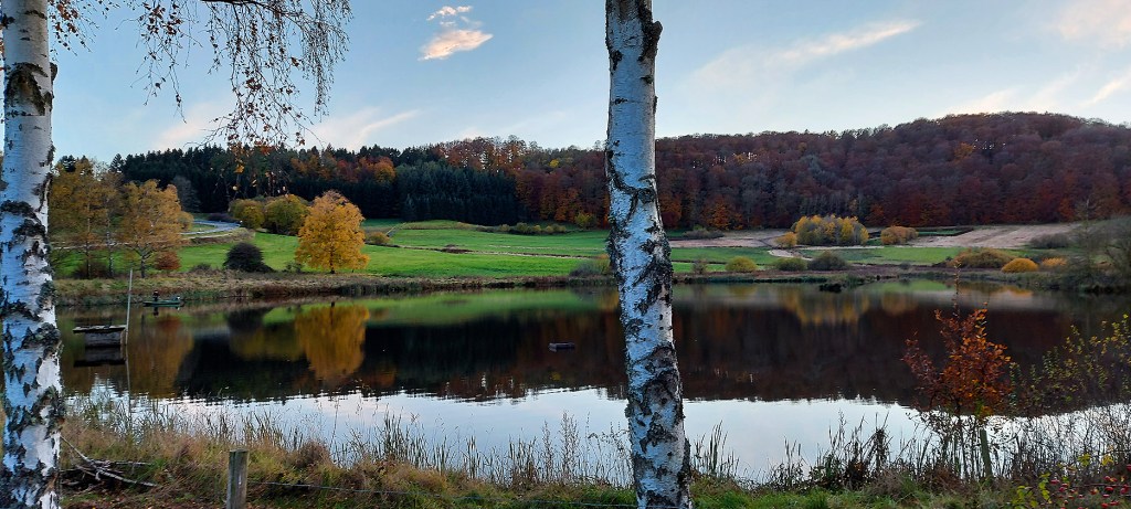 Weiter geht es durch schönsten Herbstwald hinab bis auf mittlerer Höhe oberhalb des Nitzbachtals. Vorbei an einer wilden Mufflonherde auf einer großen Wiese am Waldrand gegenüber schließlich zurück zum Doppelmaar, wo der Maarfischer im Sonnenuntergang gerade sein Ruderboot im Schuppen vertäut. Hört sich idyllisch an – und ist es auch.