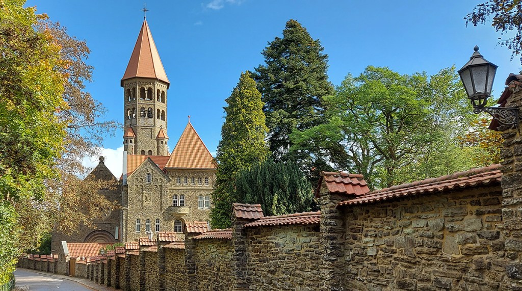 Das Städtchen überragt das von den Benediktinern 1909/1910 im neoromanischen Stil erbaute große Klostergebäude der Abtei St. Mauritius und St. Maurus. Vorbild war die Abtei von Cluny. Wenige Meter um die hohen Klostermauern herum, kurz bevor ein Pfad durch den Wald hinunter ins Städtchen führt, steht ein wuchtiges Gedenkkreuz.