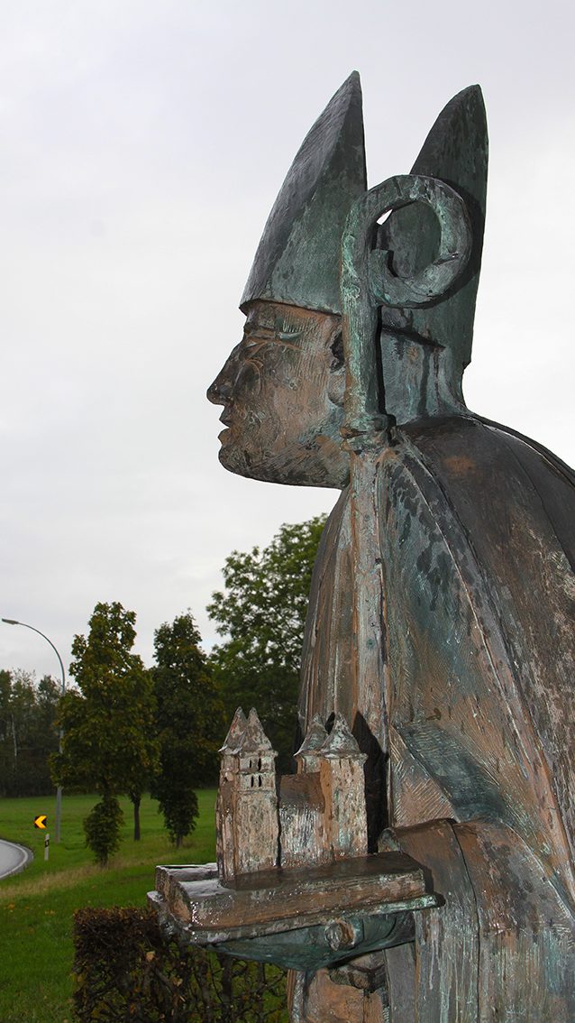 In Eile. Wie in der Bewegung erstarrt wirkt die Skulptur des „Eifelapostels“ Willibrord (658-738) vor der kleinen Kreuzkapelle am Stadtrand von Echternach. Der in Irland ausgebildete aus England stammende Missionar hat das Modell einer Kirche in der Hand: Die Basilika, in deren Krypta Willibrords Gebeine in einem schlichten merowingischen Steinsarkophag unter einem Schrein aus Carrara-Marmor ruhen.