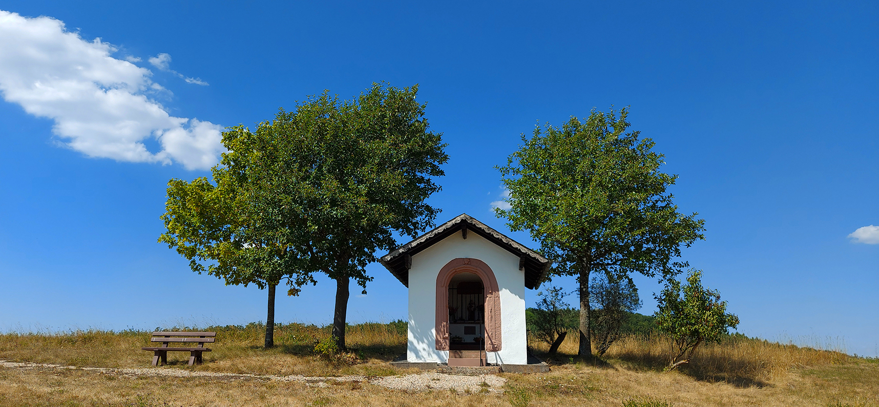 Im Kapellenland (1): Dass die Eifel eine traditionell katholische Gegend ist, sieht man nicht nur an den vielen Kirchen in den Dörfern, kleinen und mittelgroßen Städten. Auch abseits der Besiedlungen, unterwegs auf den vielen Wanderwegen in der Region, stößt man immer wieder auf Kapellchen und Heiligenhäuschen. Auf dieser Route, die auf einem „Traumpfad“ bei Naunheim im Maifeld beginnt und auf dem „Neuer-Burg-Weg“ in der Südeifel endet, ist das nicht anders.