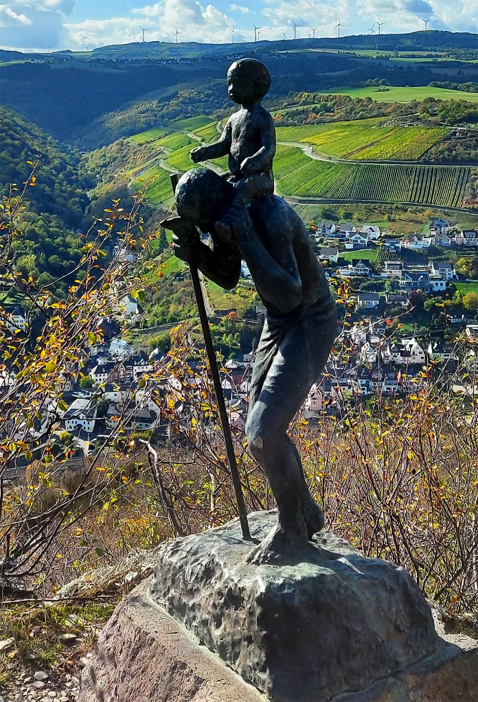 Fast auf der Kuppe des Roßsteins angekommen passiert man am Fels eine unterlebensgroße Statue aus Bronze: Der hl. Christopherus trägt das Christuskind, manche nennen das Ensemble auch nur „Vater mit Kind“. Von hier aus hat man zudem einen schönen Blick auf Oberwesel am jenseitigen Rheinufer, die Schönburg, Liebfrauen- und Martinskirche, die sehenswerte mittelalterliche Befestigungsanlage mit Türmen, Zinnen und anderes mehr.