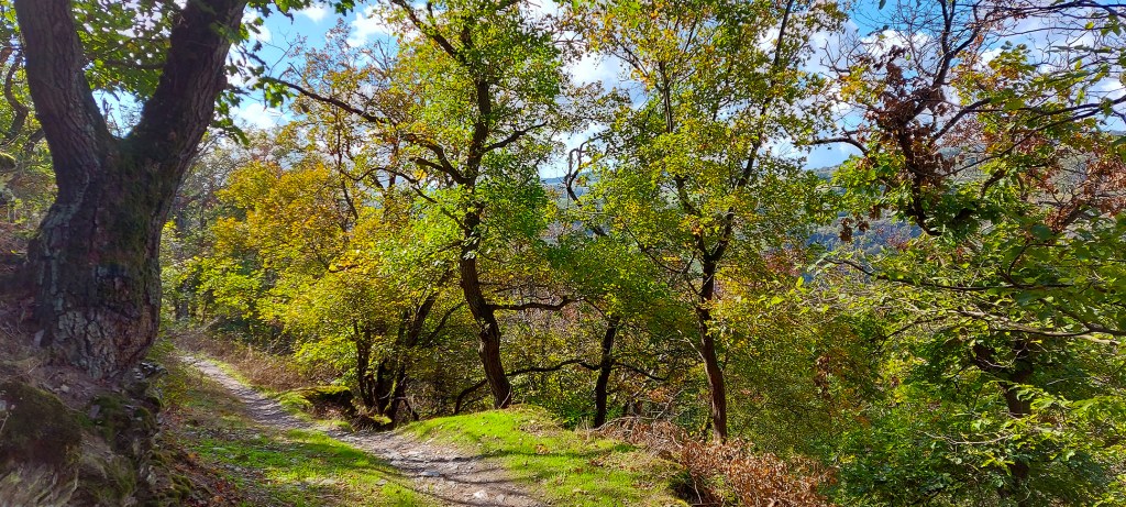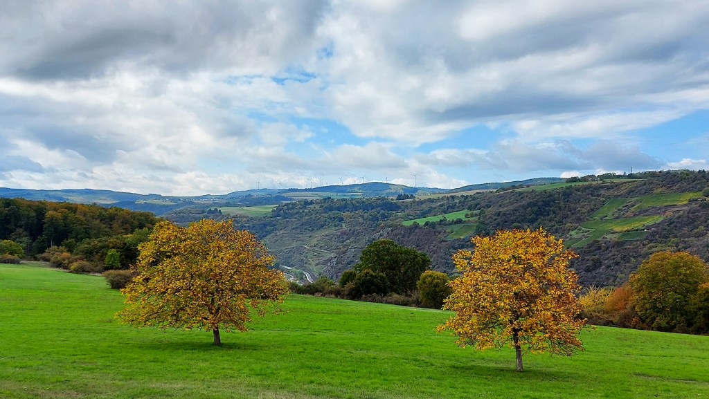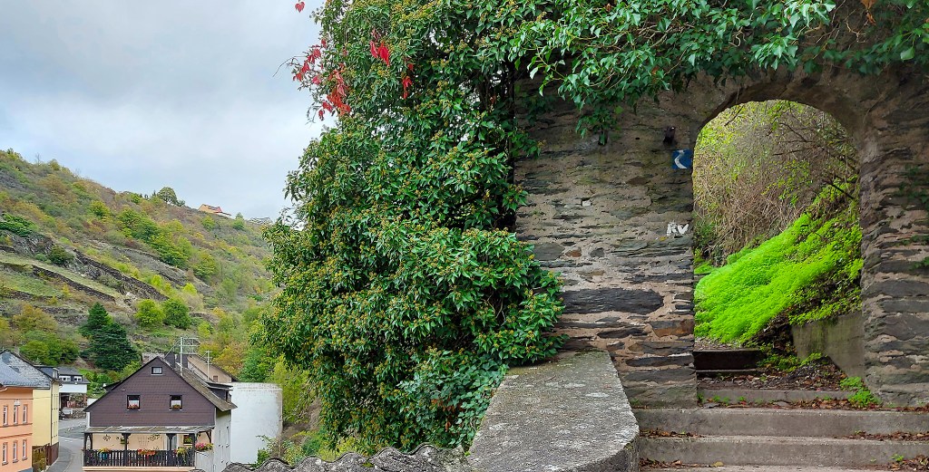 Bis hierhin war die Königsetappe des Rheinsteigs ein teilweise kraftrauendes auf und ab, nun wird es deutlich entspannter. Nach Überquerung der Hochebene unterhalb von Weisel, eine ungewohnt offene Perspektive in Richtung Taunus nach den Wanderungen durch die Hangwälder, biegt der Weg wieder zur Hangkante ab, Es geht an alten Trockenmauern entlang, erste Blicke auf die Burg Pfalzgrafenstein im Rhein bei Kaub, wenig später auch auf die Burg Gutenfels oberhalb des Ortes, die Wingerte werden mehr und größer.
