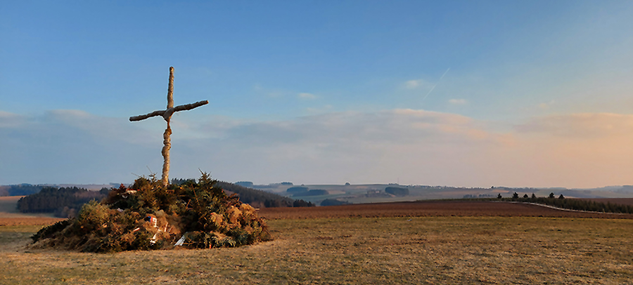 Feuerheimat : Lebendiges Brauchtum wie hier am Sonntagabend nach Karneval, dem traditionellen Termin für die Winteraustreibung durch das brennende Kreuz, die „Burg“. Aufgenommen bei Lützkampen im Islek.