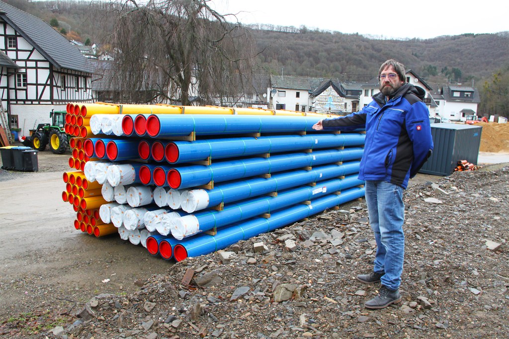 Ja, das sei ein Symbol dafür, dass es wieder aufwärts gehe, meint Olaf Justen. Doch so recht will man ihm das gerade nicht glauben. Der 51-Jährige steht an der Stelle der einstigen Hauptstraße von Schuld, die immer noch eine kaum erkennbare braune Dreckpiste ist, und deutet auf ein dickes Bündel großvolumiger gelber und blauer Leitungsrohre einige Meter vor ihm unterhalb eines abgebrochenen Stücks Asphalt. „Da stand mein Haus, genau da, wo die Trinkwasser- und Stromleitungsrohre liegen. Das Loch, das die Ahr gerissen hat, war tiefer als mein Keller.“