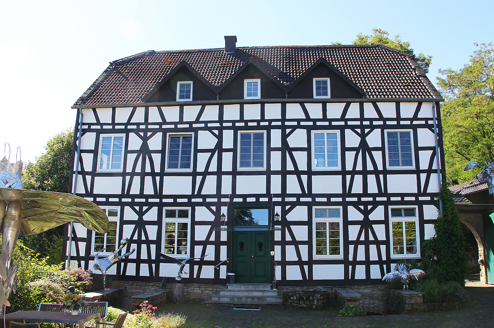 Titelbild: Die „Seiltänzerin“, eine der bekanntesten Edelstahlblechskulpturen von Peter Ratz, begrüßt die Besucher auf dem Hof in Eiserfey. Fotos: Eifelschreiber