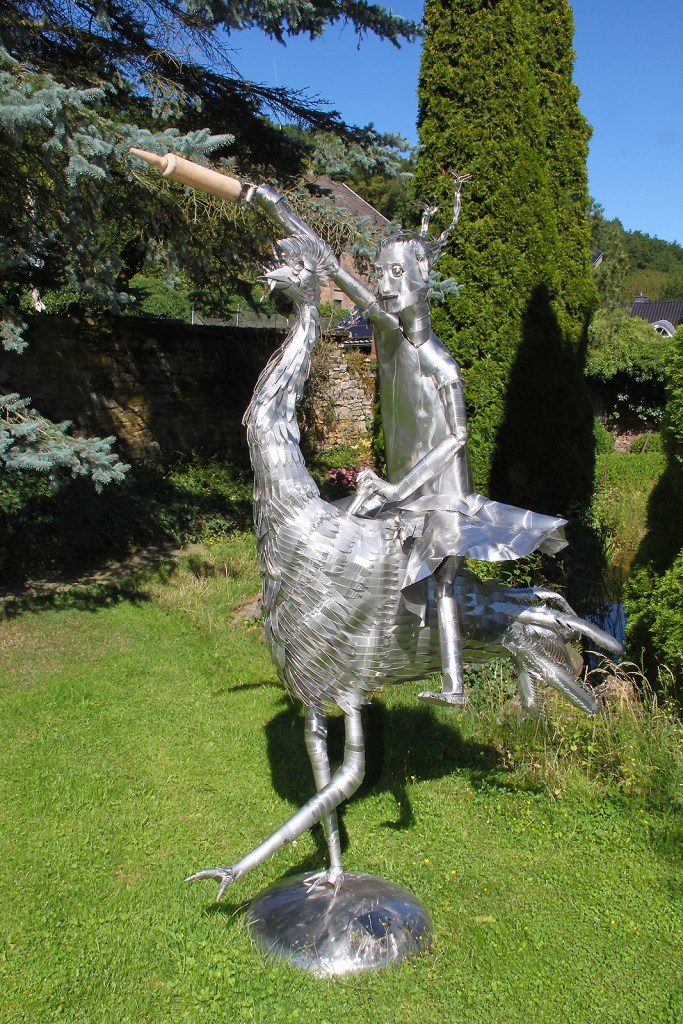 Abheben muss im Gegensatz dazu die 40 Kilogramm schwere „Seiltänzerin“ über dem Eingang zur ehemaligen Bürgermeisterei von Eiserfey nicht mehr. Sie schwebt in vier Metern Höhe auf ihrem Stahlseil. „Ich habe vor Jahren den Cirque du Soleil besucht, da trat eine solche Seiltänzerin auf, sie hat mich zu der Figur inspiriert“, meint Ratz. Die Dame unter dem Balancierschirm ist nach herkömmlichen Maßstäben keine Schönheit im hautengen Trikot. Die eher pummelige Frau trägt stattdessen eine Art Spitzenrock. Aber sie wirkt souverän. „Sie traut sich was, sie geht an ihre Grenzen. Sie riskiert viel“, kommentiert Peter Ratz die aus Edelstahlblech geschnittene und geschweißte Artistin über ihm. Genau das, die Suche nach dem eher Widerständigen, dem nicht Glatten, dem Absurden und Grotesken fasziniert den gelernten Bauingenieur, wenn er zu Plasmaschneider und Blechschere greift.