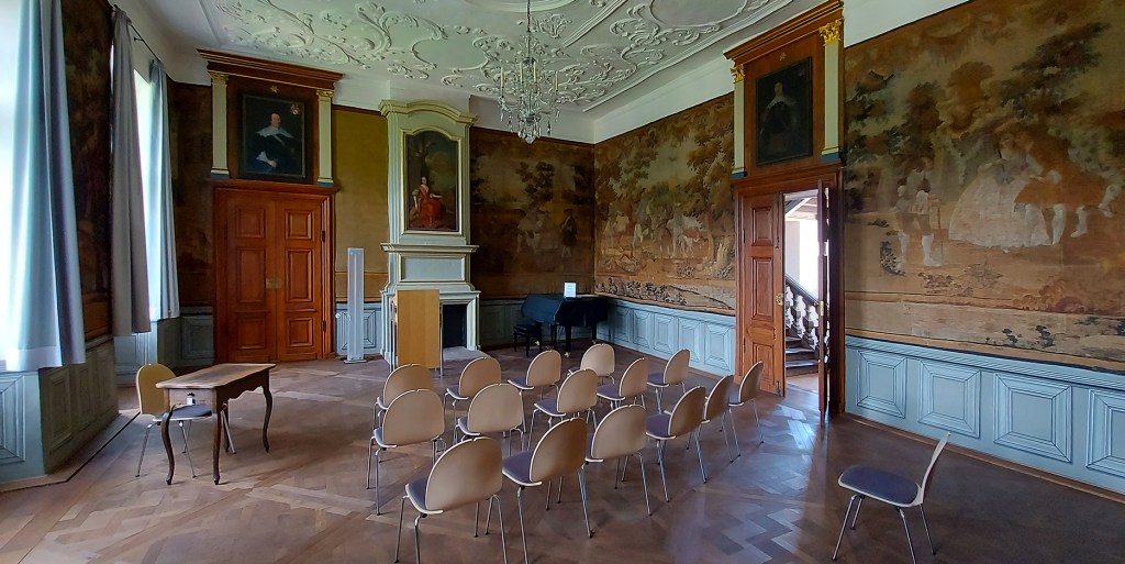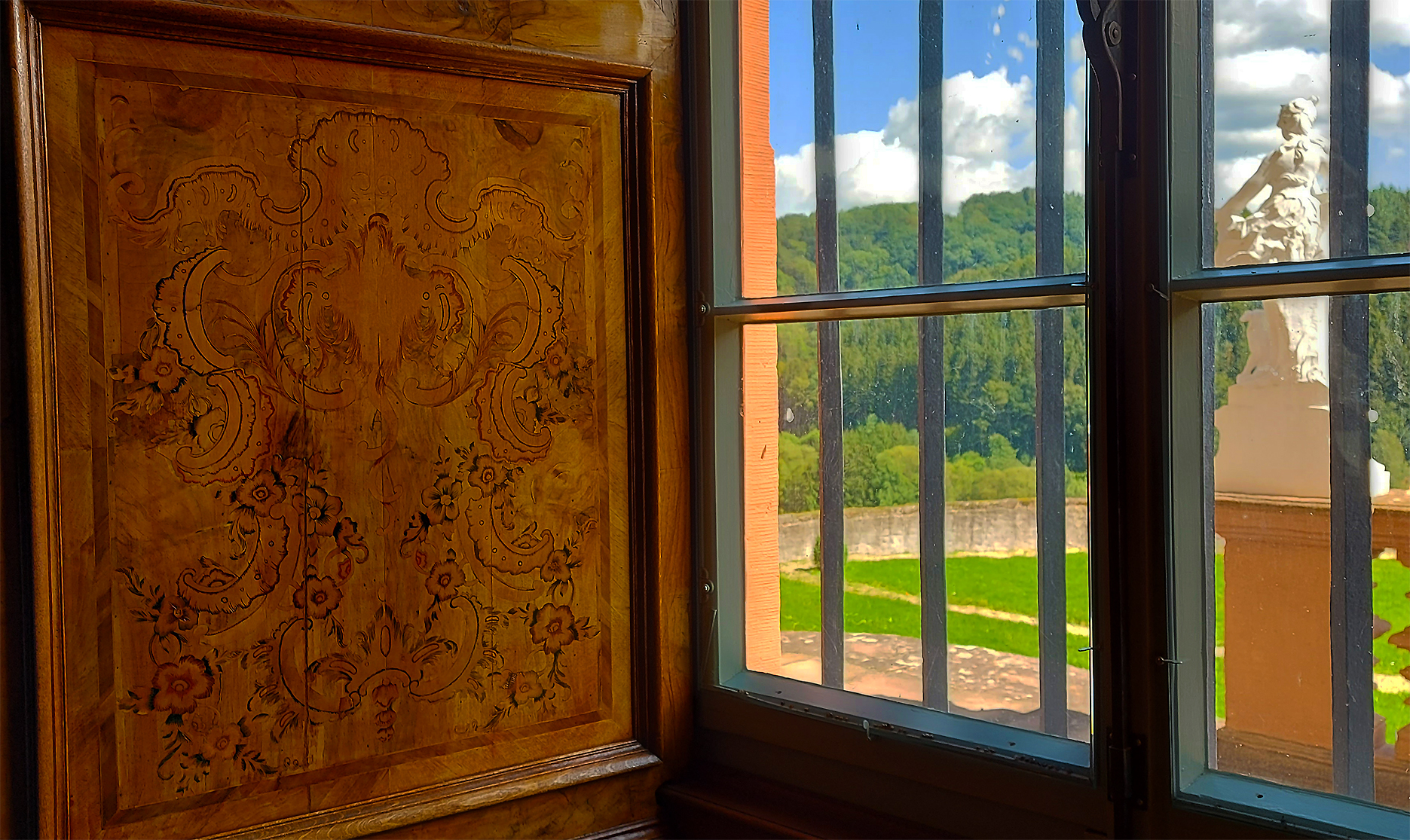 Die wertvollen barocken Leinwandbemalungen im „Musikzimmer“ zeigen höfische Szenen des Lustwandelns, der Galanterie und der Jagd, wie es damals beim Adel üblich war. Die Unikate wurden von der US Armee bei der Befreiung Malbergs inventarisiert. Marketerien in den Laibungen der Fenster des „Gartensaals“ im Erdgeschoss (rechts unten).