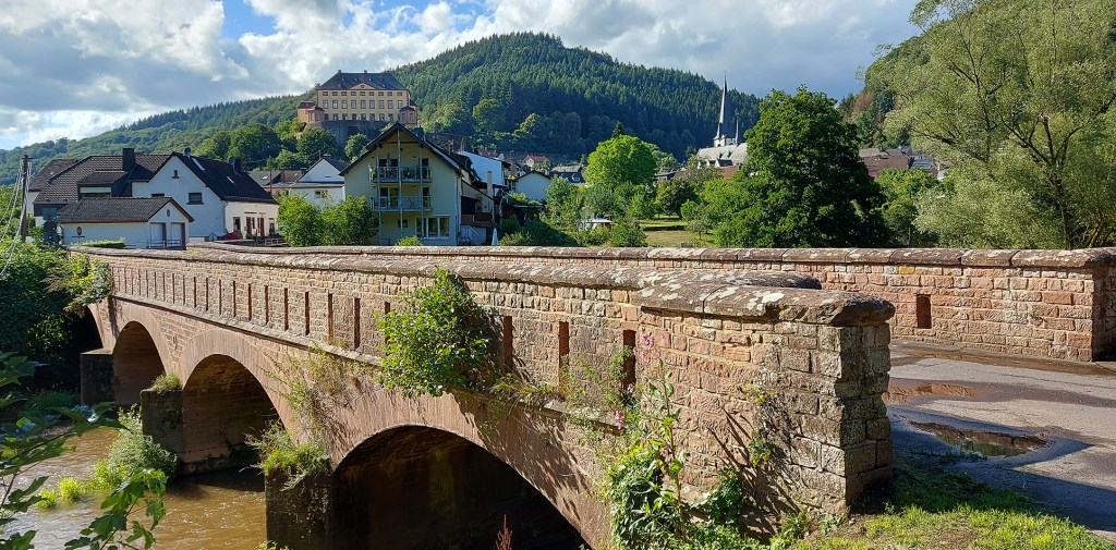 Am Kyllufer angekommen macht Marius Thiel die alte Brücke über den Fluss Sorgen. Sie musste nach dem Julihochwasser 2021 saniert werden, neue Fundamente für die Stützpfeiler waren nötig. Weitere aufwändige Ausbesserungsarbeiten stehen noch an. Finanziert wird das aus dem Wiederaufbaufonds des Landes Rheinland-Pfalz wie auch die Beseitigung von Straßenschäden oder an der Dorfhalle am Kyllufer, die überflutet wurde. An die 430.000 Euro sind alleine für die Halle aufgerufen.