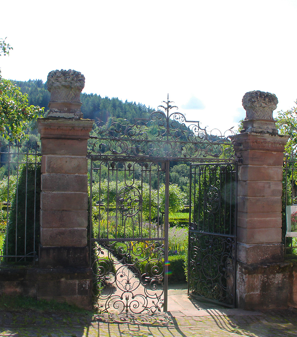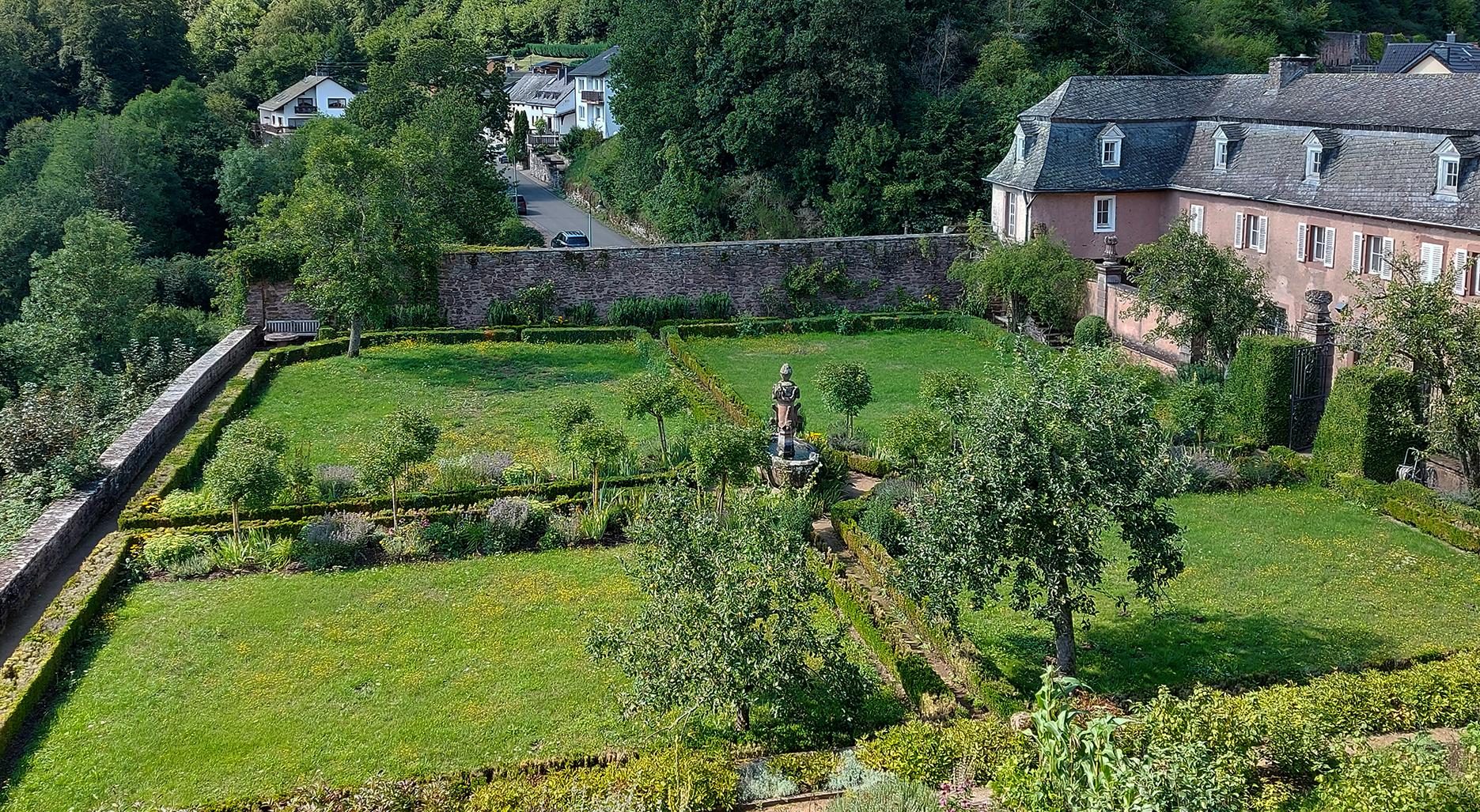 Mit Schlossführerin Renate Kappes, die das Ehrenamt seit 23 Jahren hat, geht es nun vorbei am nach dem einfriedenden Staketenzaun benannten barocken „Eisernen Garten“ – unverstellter Blick von der Außenmauer in die Waldeifel an der Kyll – an der einstigen „Brauerei“ vorbei, durch das „Obere Tor“ auf den Schlossplatz. Im Rücken hat der Besucher jetzt das „Alte Haus“ mit dem markanten schlanken „Uhrenturm“, aus dessen versetzt eingebautem Dachfenster man vielleicht einst auch astronomische Beobachtungen des nächtlichen Sternenhimmels über der Waldeifel machen konnte.