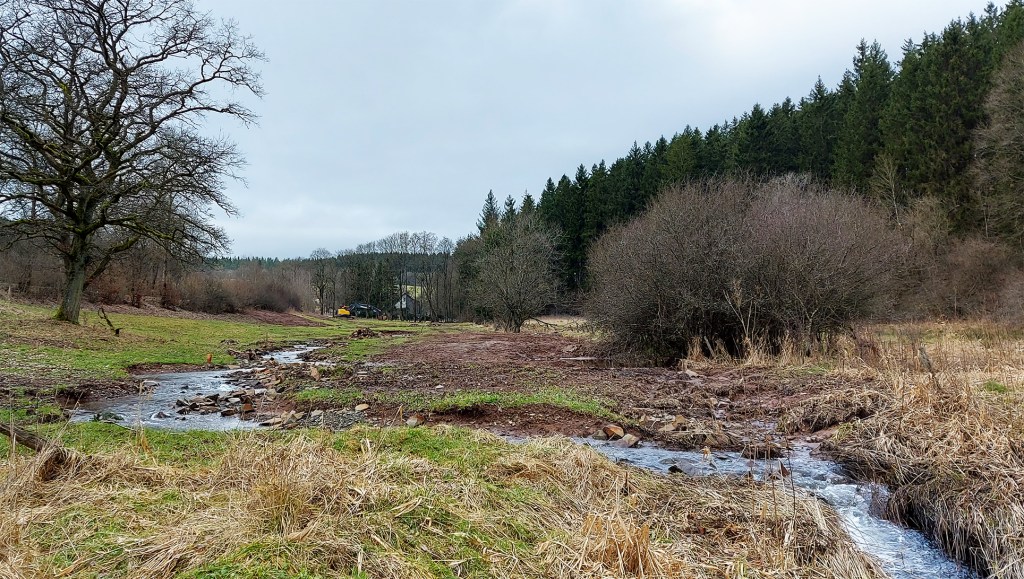 Da plätscherte nichts, da schoss das Wasser ungebremst bergab in Richtung Kronenburger See. Aus Drainagen in den Uferwiesen wurde das Bächlein zusätzlich gezielt mit Wasser versorgt. So wollte und will man bis heute gewässernahe Wiesen für die Nutzung der Landwirtschaft möglichst schnell entwässern können – wie der Bach aussieht, in den entwässert wird, das hat lange Wenige interessiert. „Seit dem Julihochwasser stellen wir aber einen Sinneswandel bei Vielen fest“, so Marietta Schmitz von der Biologischen Station. „Gewässerrenaturierung wird plötzlich als sinnvoll, auch für den Hochwasserschutz angesehen.“