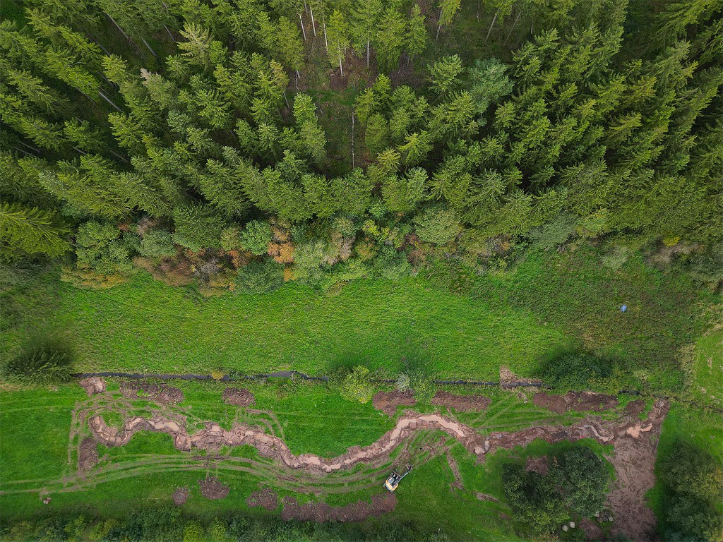 Nahe des Waldrands jenseits der Schleidener Straße in Richtung Kreisverkehr nach Udenbreth, Rescheid und Dahlem, ist die Berke eigentlich auch auf dieser Teilstrecke in ihrem bisherigen Bett ein schnurgerader Strich, in den 1950er Jahren in ein künstliches Bett eingezwängt. Doch Jens Gelderblom konnte in alten Karten der Region, etwa des französischen Obert Joseph Tranchot, der zwischen 1801 und 1814 auch die Eifel kartografierte, den alten, wild mäandernden Bachverlauf für seine Neumodellierung des Bachbettes rekonstruieren. Zuvor war eine Vermessung des Geländes erfolgt.