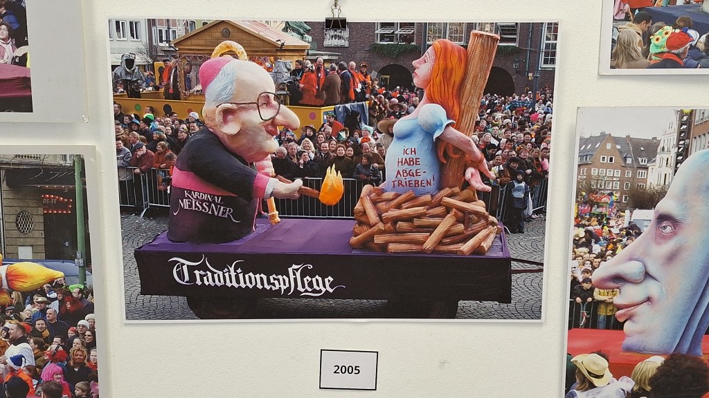 Deutsche Missstände bleiben bei alldem nicht unbedacht. Seit Anfang der 2000er Jahre und bis heute ist die katholische Kirche eines der Hauptangriffsziele Tillys: 2005 stellte er einen genüsslich blickenden damaligen Kölner Kardinal Meissner dar, der dabei ist den Scheiterhaufen einer Frau zu entzünden – aus „Traditionspflege“, gemeint ist die der Inquisition. Ihr Vergehen: „Ich habe abgetrieben“ steht blutrot auf ihrem Kleid. Danach ist der Missbrauchsskandal in der katholischen Kirche immer wieder Thema.