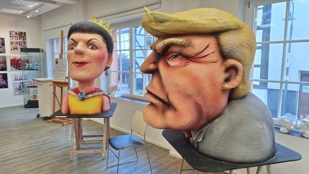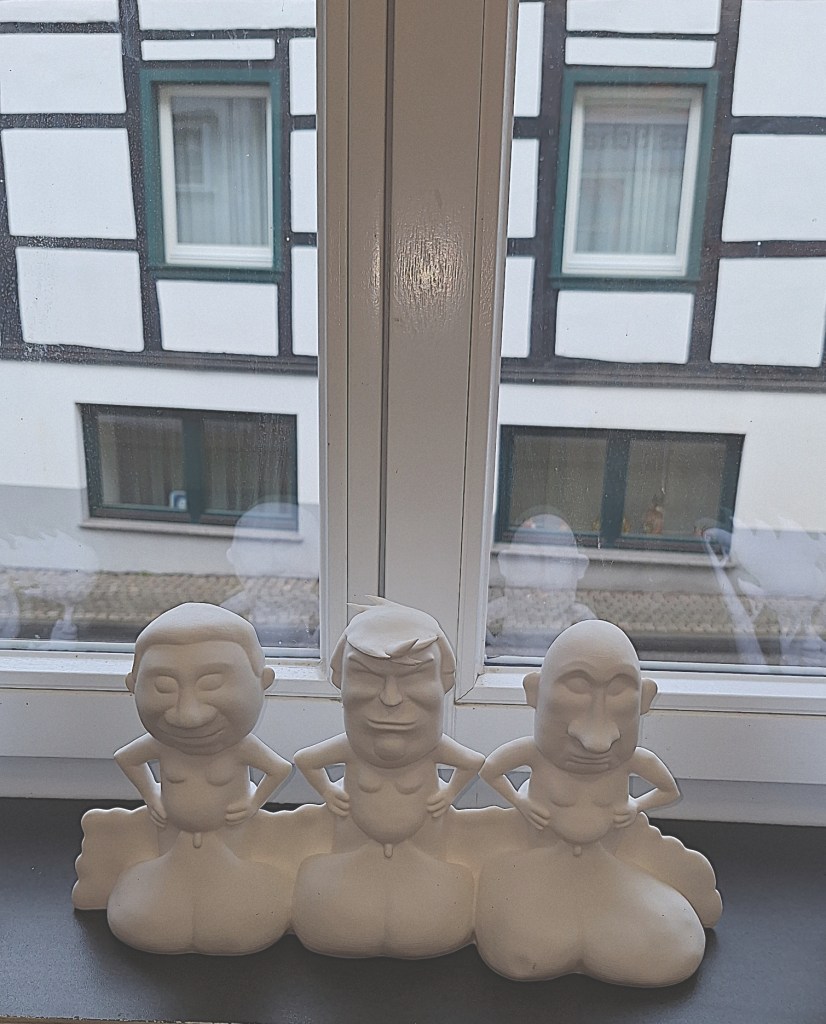 Ein weiteres Daueraufreger für Tilly ist natürlich Donald Trump. Schon zu Beginn von Trumps erster Amtszeit als Präsident der USA von 2017-2021 bezog der Wagenbauer gegen dessen Ziele Position. Er stellte ihn mit Putin und Chinas Staatspräsident Xi Jinping in eine Reihe: Drei nackte Großbonzen mit Riesenhoden – beschriftet mit „Make Russia great again“, make America great again“, make China great again“ und Mini-Penissen. Die Modelle, die vor jedem Entwurf gebaut werden, sind in Heimbach zu sehen.
