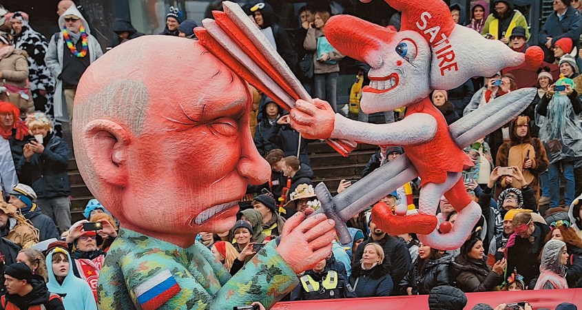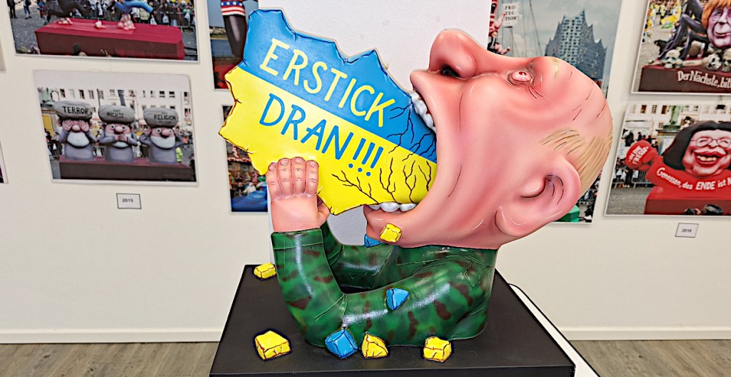 Ein Vladimir Putin, der versucht die Ukraine zu verschlingen – Tillys Claim dazu: „Erstick dran!!!“. Putin in diesem Jahr sogar in direktem Clinch mit einem kleinen Düsseldorfer Hoppeditz, in dem sich Jacques Tilly selber sieht: Der Narr, der satirisch die Wahrheit sagt, wird von einem Putin, dem der Geifer aus dem Mundwinkel trieft, mit dem Schwert aufgespießt. Der kleine Narr wehrt sich mit dem, was ihm zur Verfügung steht: Die Narrenpritsche saust auf Putins Kopf. Kasperletheater.