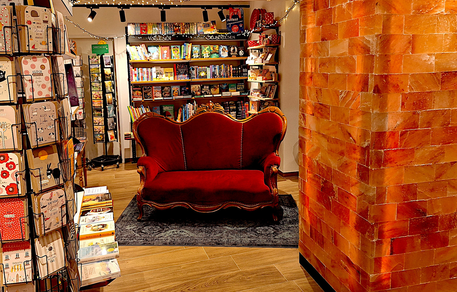 Innen drin ist nach der Generalsanierung alles neu – bis auf das bekannte alte rote Sofa, dass Mütter vor dem Hochwasser retten konnte. Es steht prominent in der Leseecke. Hinter einer Säule, die mit rot-orange leuchtendem Salzblock verkleidet ist. Es stamme von einem Freund, der einen Salzstock besitze, so Mütter. Das Ergebnis sieht nicht nur schön aus, es ist natürlich auch in der Region in der Form ein Unikat – „und das Salz schafft ein angenehmes Raumklima“, so Josef Mütter.