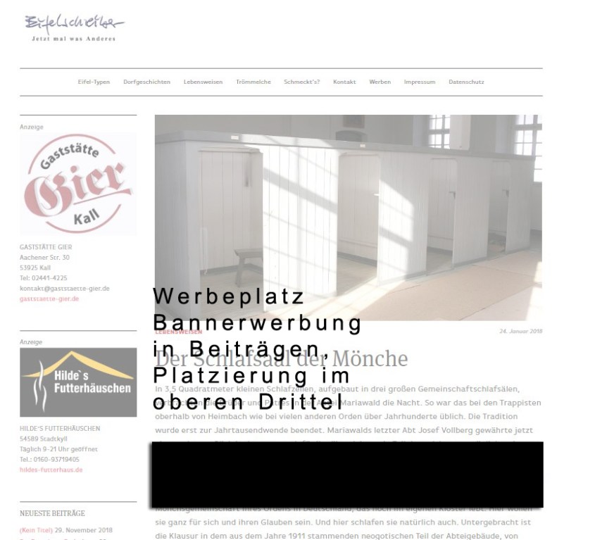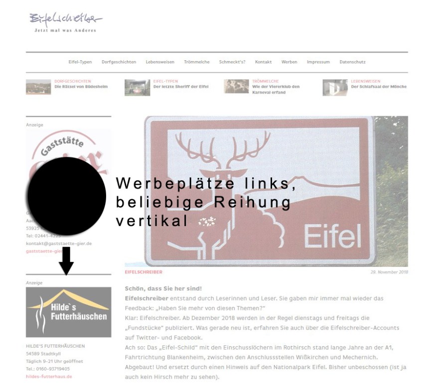Auf Eifelschreiber gibt es Werbeplätze auf der linken Seitenkolumne. Hier sind alle Platzierungen in vertikaler Reihung möglich. Ihre Werbung taucht so auf allen Seiten auf.